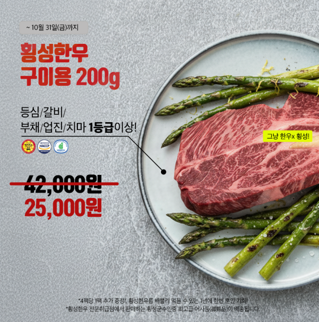 품목 또는 명칭 횡성한우 구이 초특가, 200g (냉장, 1등급)